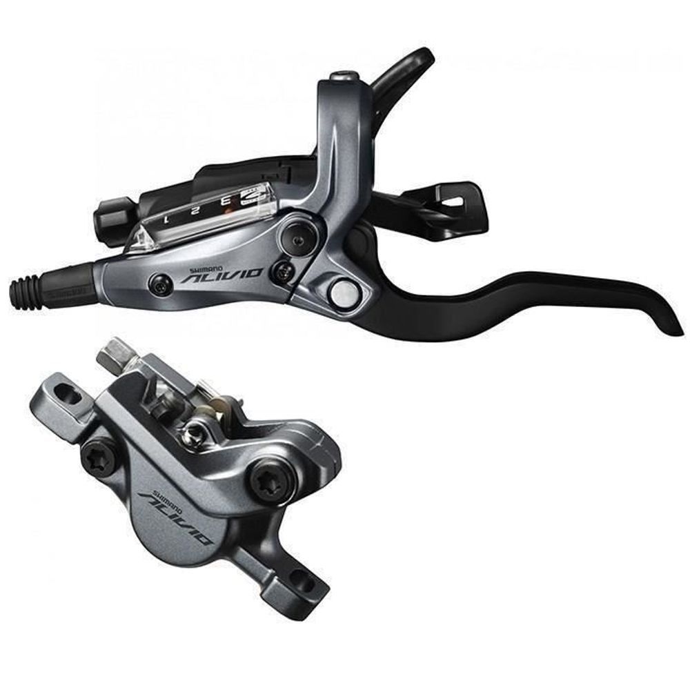 Freio Hidráulico Shimano Alívio M4050 com alavanca rapid fire 3x9 integrada, montados, sangrados de fábrica e prontos para uso.